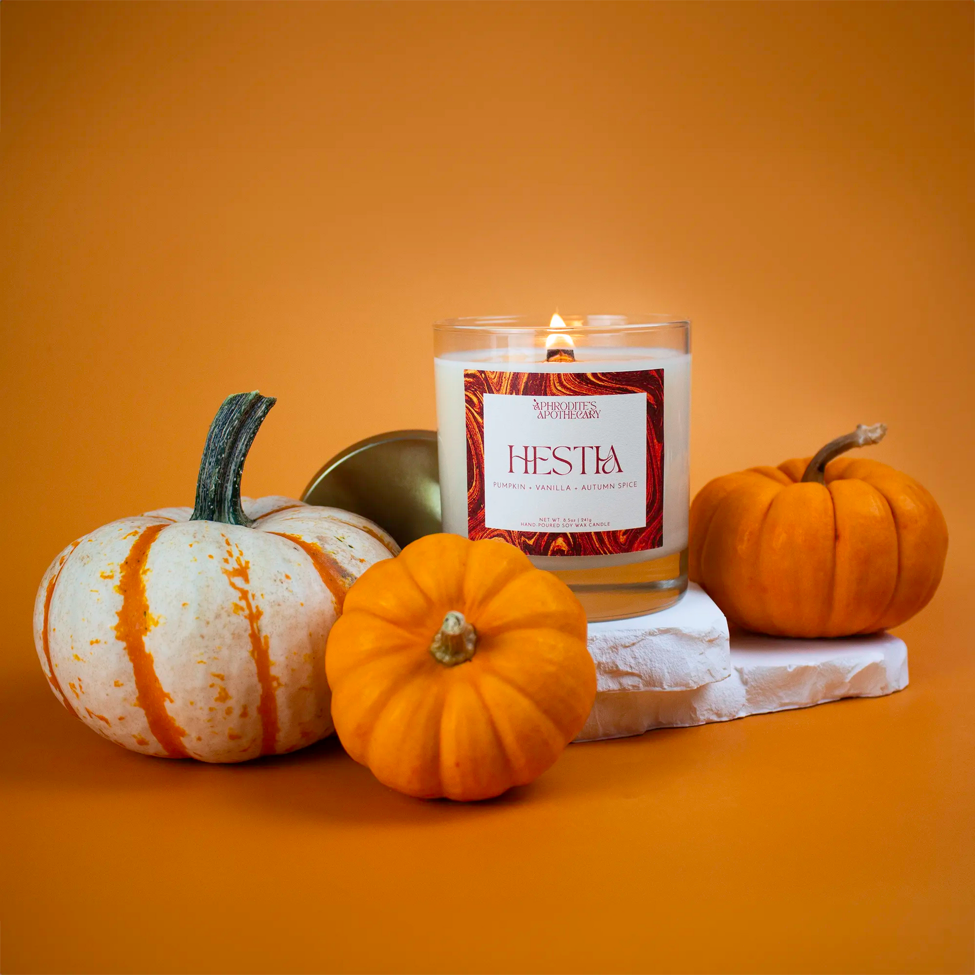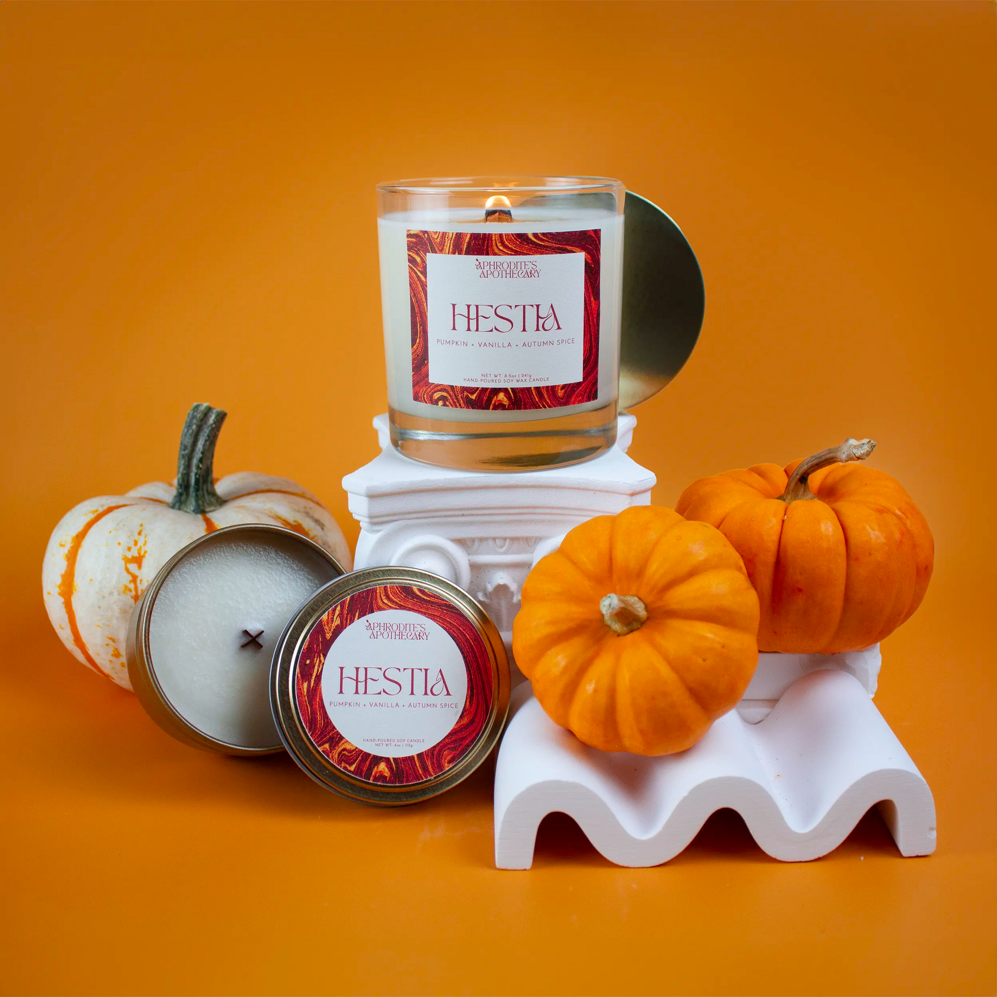 Our Hestia Candle combines pumpkin, nutmeg, cinnamon, and vanilla to create a warm and cozy vibe that's perfect for chilly autumnal days (or, any day you want to be cocooned in a warm blanket!). Hestia is the goddess of the hearth, home, and family life. Indulge in our Hestia Candle and let her warm, positive energy fill your home. As the scent of pumpkin pie spice wafts through the air and our one-of-a-kind x-shaped wood wick crackles, imagine yourself cozied up in a plush chair by a flickering fire.