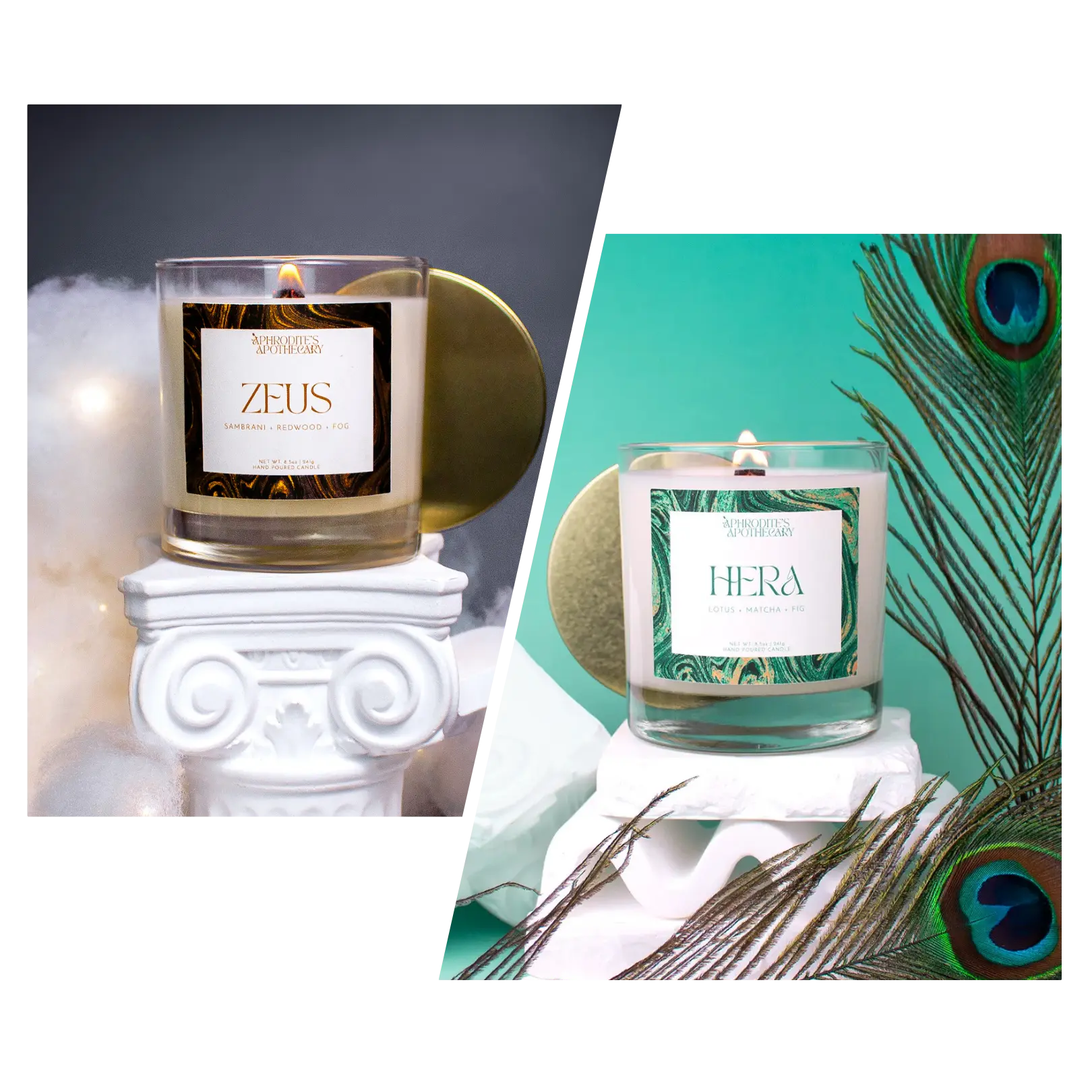 Experience the balance of divine power with our King & Queen Candle Duo. This bundle features our Hera and Zeus candles; two fragrances diametrically opposed at first glance, but which pair beautifully together.  Both candles demonstrate each deities' divine power: like her personality, Hera is gentle, yet commanding while Zeus is masculine and powerful while hiding a hint of a softness.